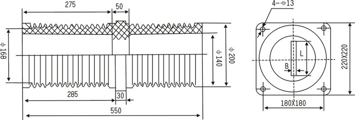 35KV穿墻套管為環(huán)氧樹脂APG工藝壓力凝膠成型結(jié)構(gòu),外形結(jié)構(gòu)尺寸大小為128(100×100)mm、高225mm。主要適用于額定電壓為10KV及以下的成套設(shè)備中,作絕緣隔離和聯(lián)接過度之用。套管耐污及潮濕,無需特別維護(hù),只需定期地清理表面污質(zhì)。安裝時母排從孔內(nèi)穿過。
