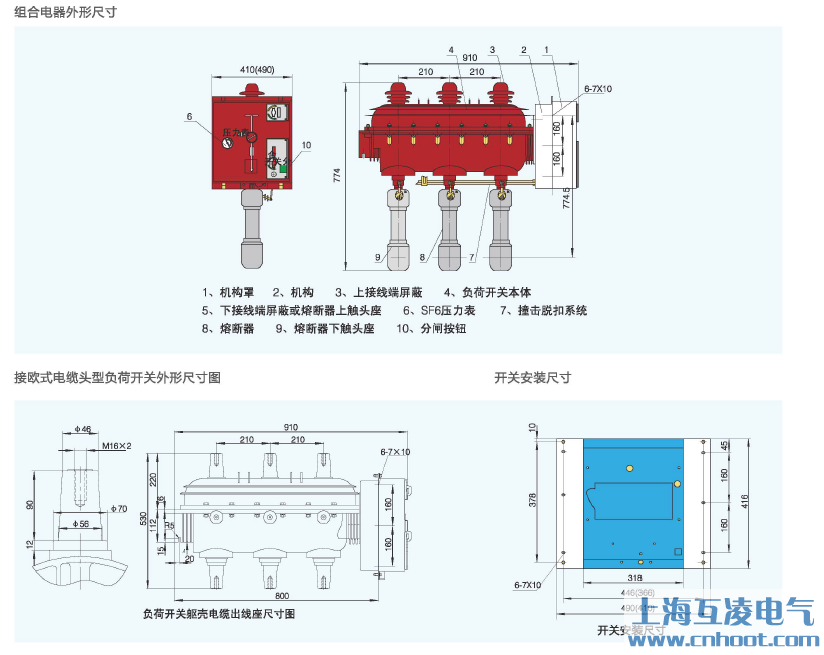 負荷開關和組合電器由相同的絕緣軀殼開關本體、相同的彈簧操動機構(gòu)、熔斷器觸頭座和熔斷器動作撞擊脫扣系統(tǒng)組成。裝可觸摸型電纜前接頭負荷開關由專用的絕緣軀殼開關本體、通用的彈簧操動機構(gòu)組成。